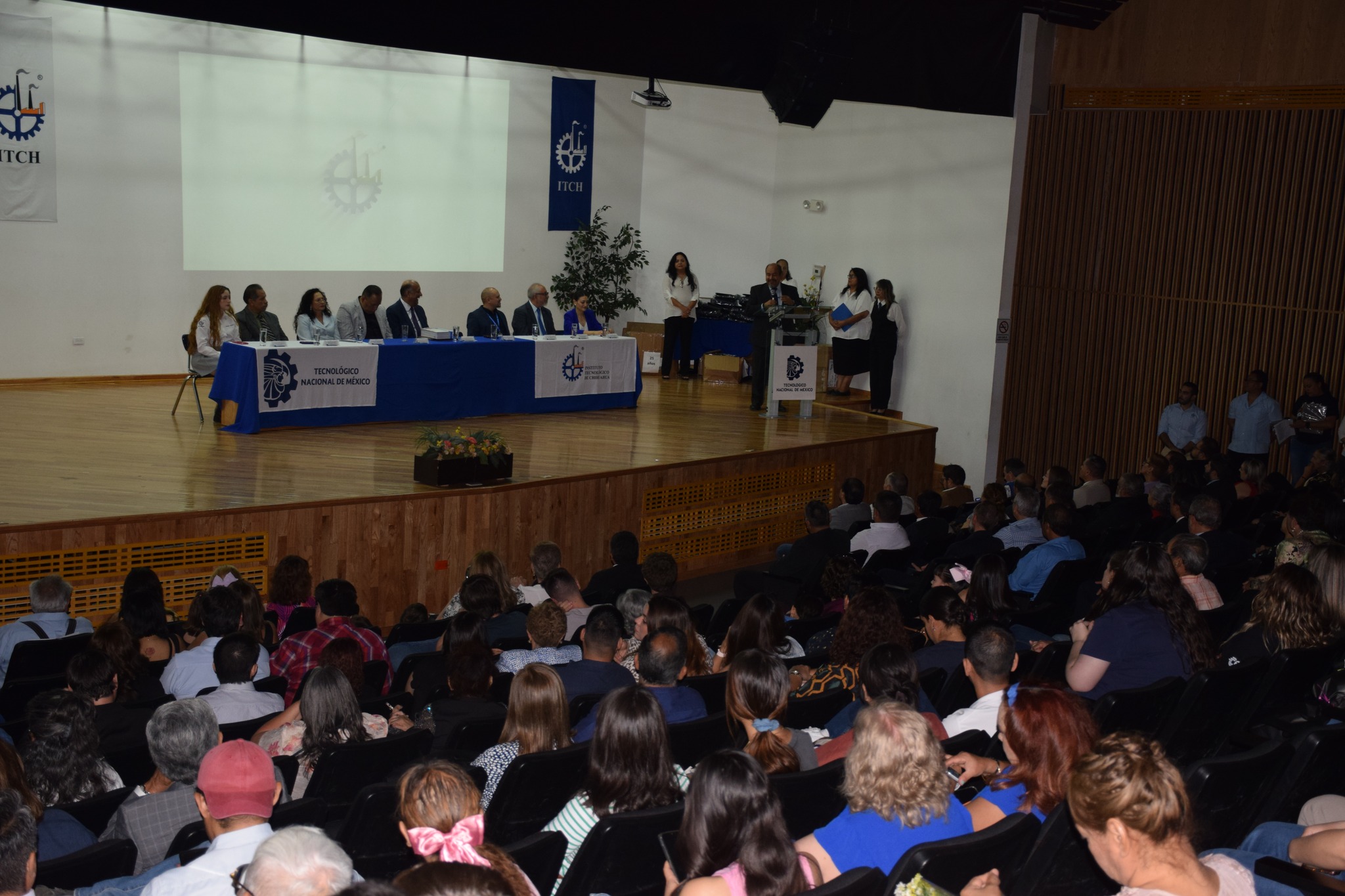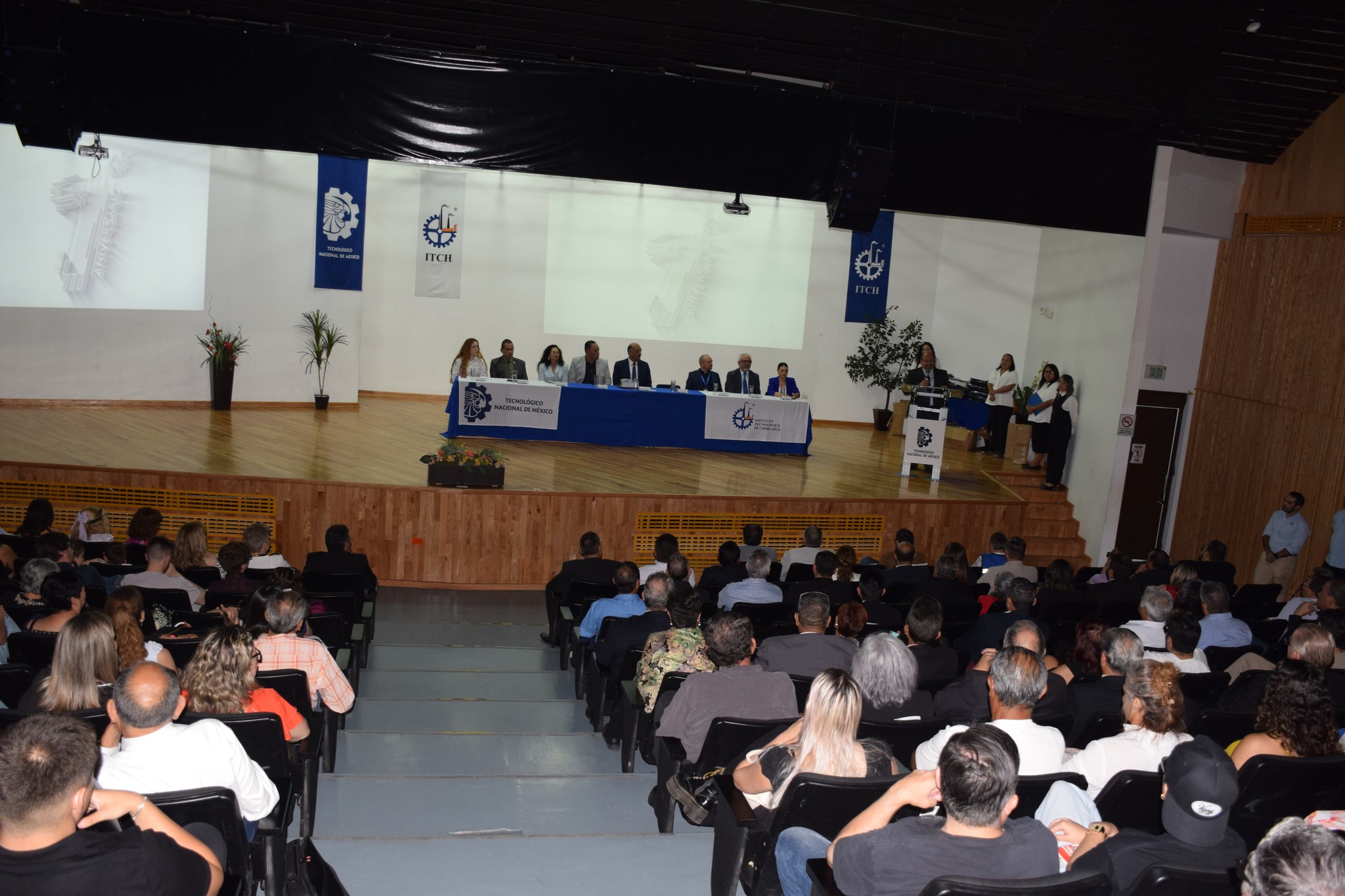 En punto de las 12:00 hrs., comenzó tan esperada ceremonia magna de aniversario con la entrega de reconocimientos por años de servicio al personal docente y administrativo, iniciando con los Honores a la Bandera, recibiendo nuestro Lábaro Patrio y entonando el Himno Nacional Mexicano, a cargo de la Banda de Guerra y Escolta del ITCH.
