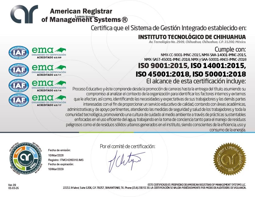El Instituto Tecnológico de Chihuahua celebra con orgullo el dictamen favorable de certificación de nuestro Sistema de Gestión Integrado. Este importante reconocimiento confirma el cumplimiento de las normas ISO 9001, ISO 14001, ISO 45001 e ISO 50001, consolidando nuestro compromiso con la calidad, el cuidado ambiental, la seguridad y salud en el trabajo, así como la eficiencia energética.