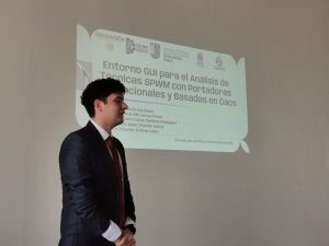 Durante el evento Hiram presentó el proyecto titulado: “Entorno GUI para Análisis de Técnicas SPWM con Portadoras Convencionales y Basadas en Caos”, una herramienta de simulación que contrasta portadoras tradicionales con señales caóticas en modulaciones SPWM, explorando su potencial en el desarrollo de nuevas aplicaciones para la electrónica de potencia.