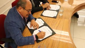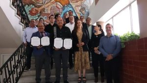 Posteriormente, se realizó la firma formal del documento por parte del Dr. Omar Bazán Flores y del Mtro. Alfredo Villalba Rodríguez, acompañados por las autoridades que integraron la mesa de honor por: