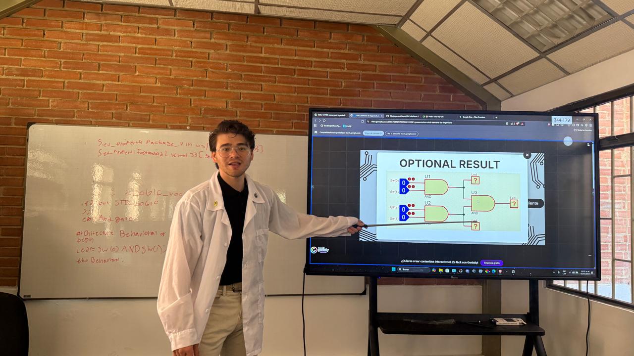 Nos llena de orgullo compartir que nuestro estudiante Maximiliano Batres Rodríguez, del TecNM Campus Chihuahua, fue convocado por la Universidad de Cundinamarca (Colombia) para impartir el Taller Introductorio a VHDL, dentro de su formación internacional en el Programa PILA.